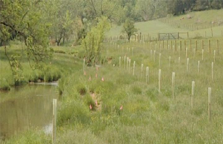 image: Riparian buffer designs studied included widths of 35 to 100 feet, some all grass, some all trees, and some -- like the one shown -- both trees and grass. On some, the effects of harvesting grass every year and trees every three years were modeled.