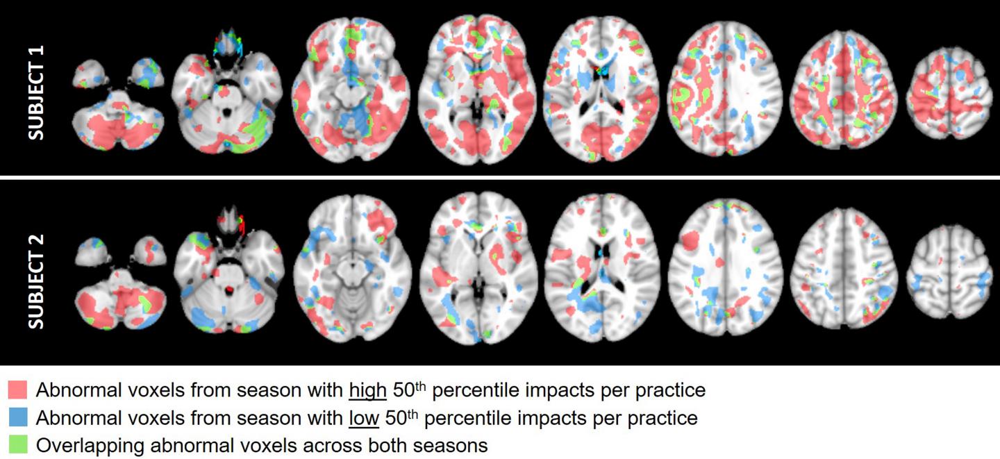 image: Imaging data from two football athlete subjects showing a comparison between abnormal voxels from the season with the
