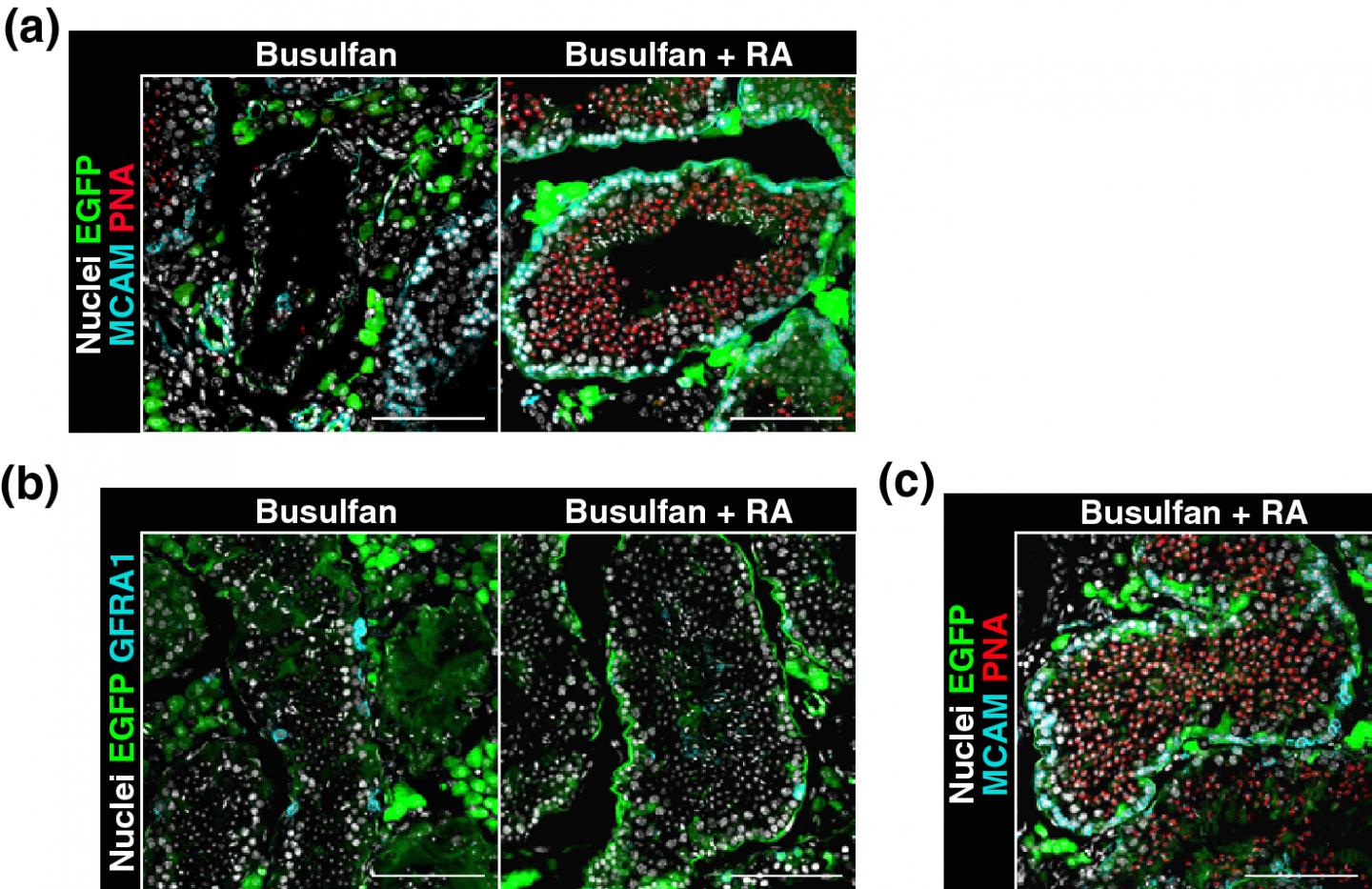 The reason for the negative prognosis in testis tissue transplantation was due to the depletion of germ cells which contribute to retinoic acid (RA) synthesis in the testes. In this context, they succeed in ameliorate donor spermatogenesis by RA administration in recipients to produce healthy offspring via intracytoplasmic sperm injection, a typical method in assisted reproductive technology in humans.