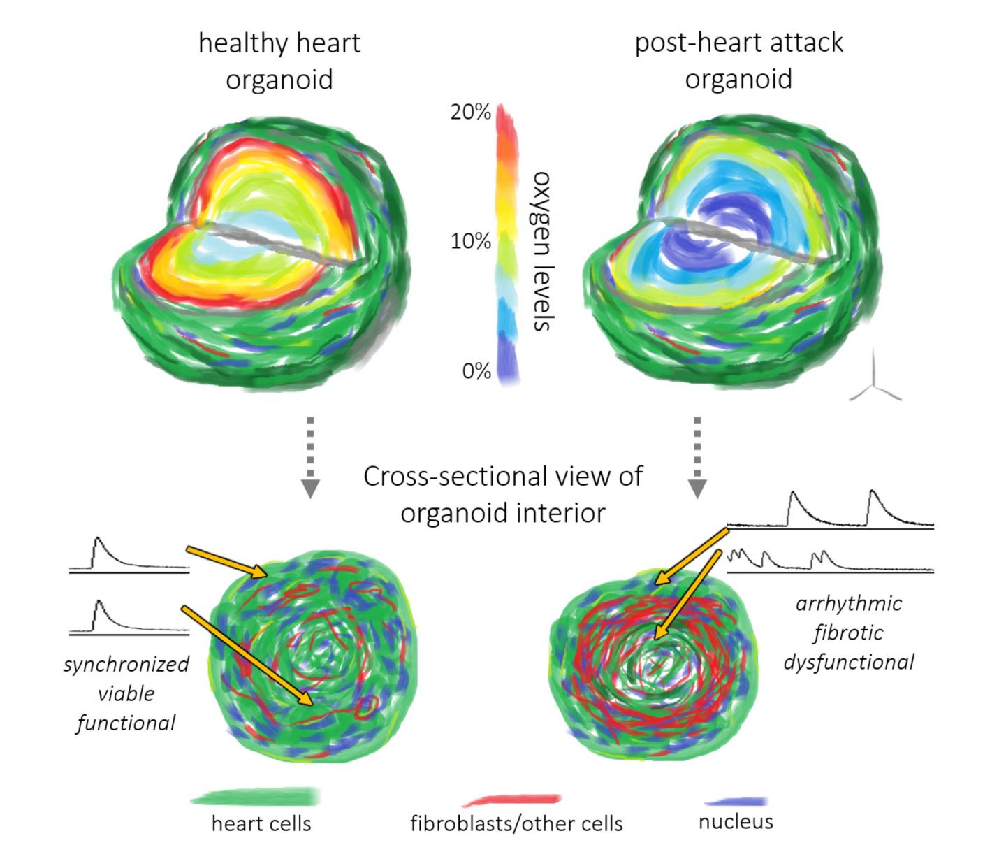 In contrast, the cardiac organoid recreates a human version of the heart and closely resembles the tissue dysfunction that takes place after the oxygen shortage caused by a heart attack. Because it is very difficult to obtain a sample immediately after a heart attack occurs, most of what we know about heart attacks comes from observations made long after the initial oxygen shortage. The organoid model fills in this gap, enabling visualization immediately after oxygen deprivation.