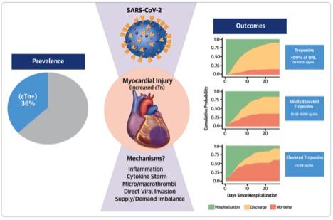 image: Myocardial injury reflected by troponin concentrations above the upper reference limit (URL) of normal (>0.03ng/mL) was present in 36% of patients hospitalized with COVID-19.