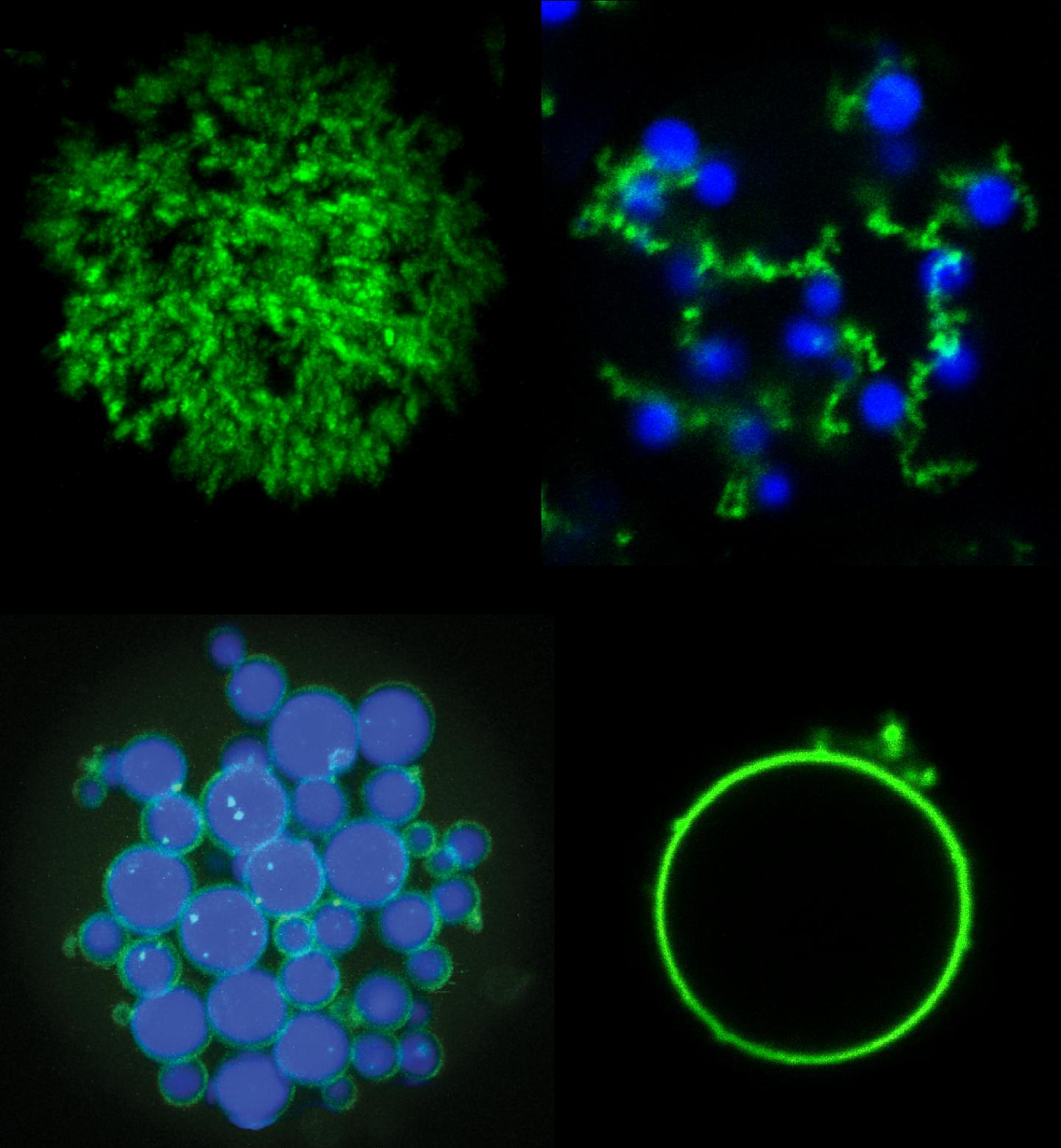 image: Mixtures of POPs (green) and ELPs (blue) can be used to create a variety of new microparticle architectures including (clockwise from upper left) porous particles, 'fruits-on-a-vine' networks, single hollow 'vesicle-like' particles, and core-shell networks.