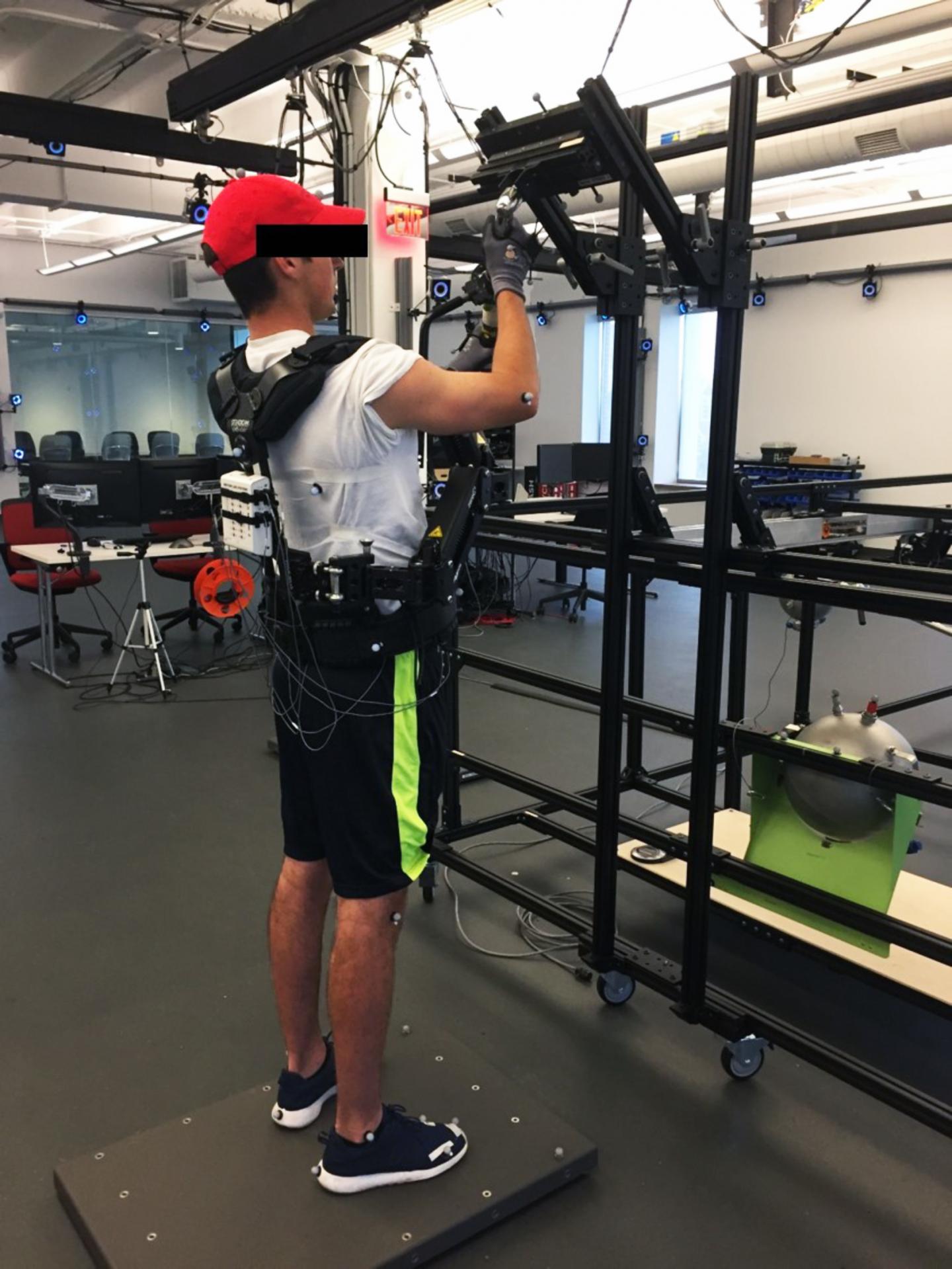 image: For a study at The Ohio State University, an experimental subject operates a hand tool while wearing an exoskeleton.