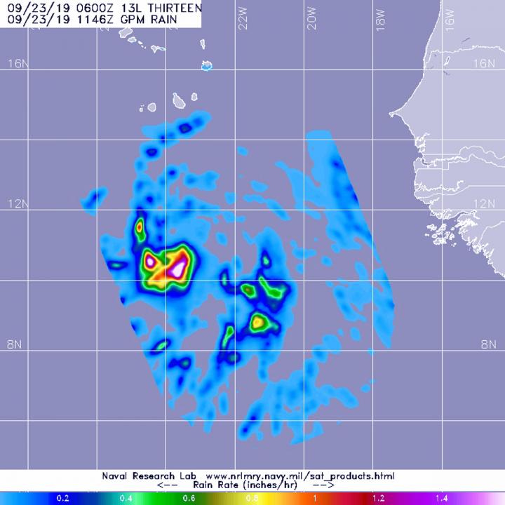 The Global Precipitation Measurement mission or GPM core satellite passed over the eastern North Atlantic Ocean on Sept. 23 at 7:46 a.m. EDT (1146 UTC) and provided rainfall rates in Tropical Storm Lorenzo. The heaviest rainfall was occurring around the center, falling at a rate of over 36 mm (about 1.4 inch) per hour and at a rate of 25 mm (about 1 inch) per hour around a band of thunderstorms southeast of center. Both the Japan Aerospace Exploration Agency, JAXA and NASA manage GPM.
