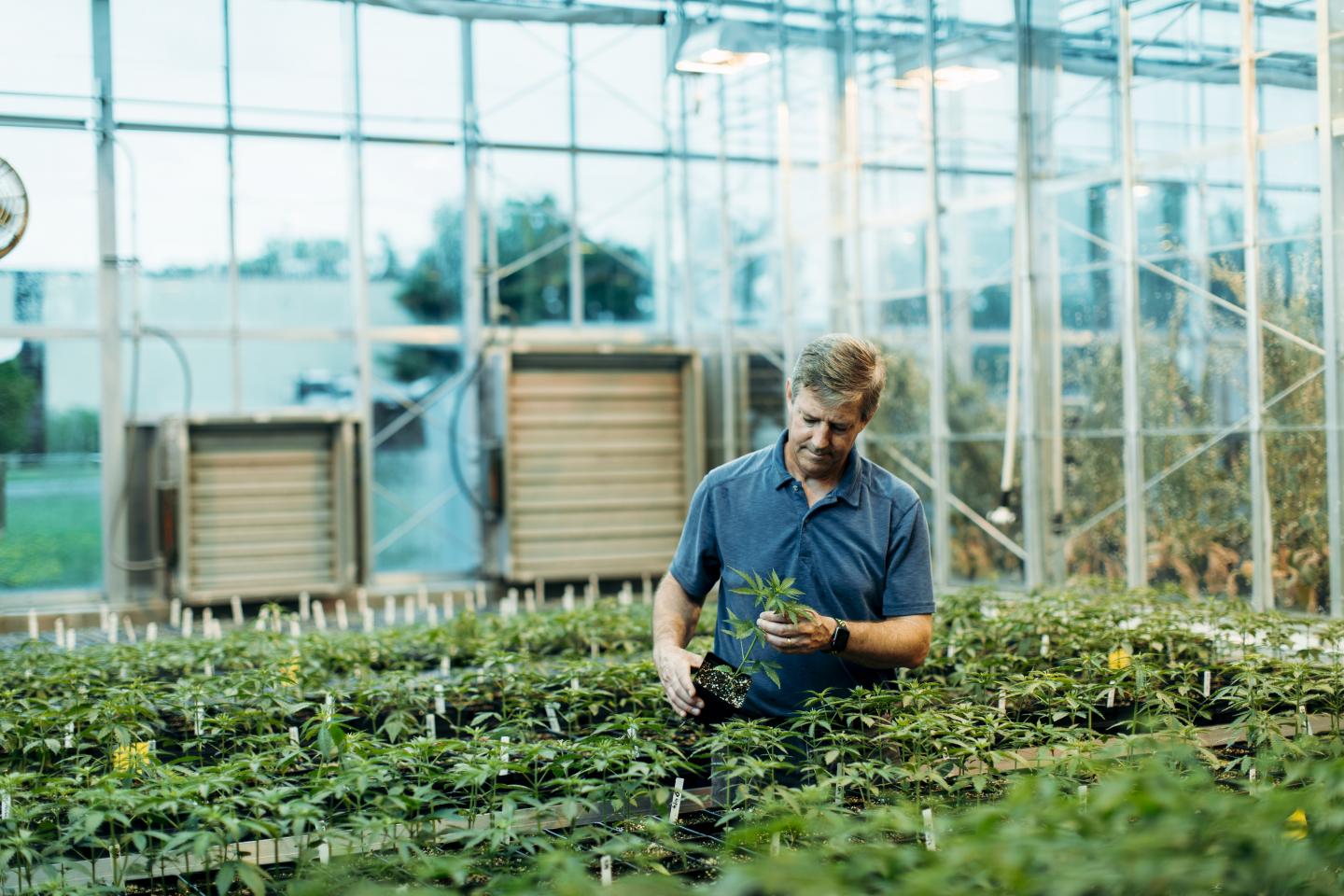 image: Horticulture professor Larry Smart examines industrial hemp plants growing in a greenhouse at Cornell AgriTech in Geneva, New York.