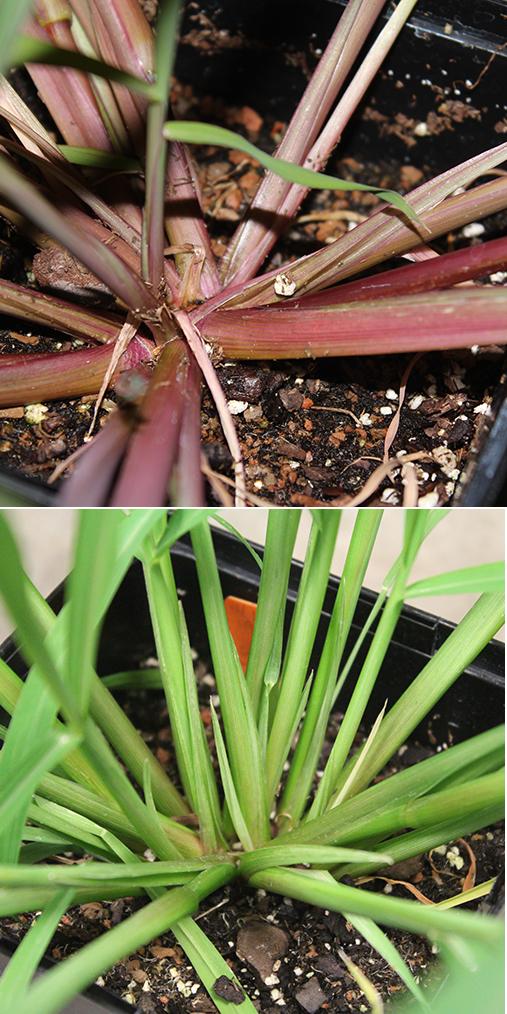 image: The common form of barnyard grass (top) has red stems, while the mimic has green stems -- more like rice.