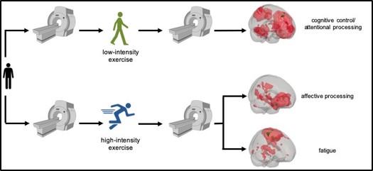 image: After low-intensity exercise, Rs-MRI showed that networks in the brain associated with cognitive control/attention were stimulated, while after high-intensity exercise, networks associated with emotions were more active, and those related to fatigue/motor function, decreased.