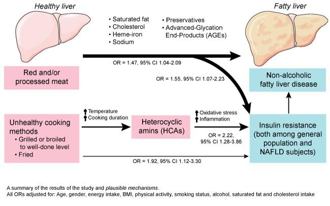 image: This is the summary of the results of the study and plausible mechanisms to explain the association of red and/or processed meat and unhealthy cooking methods and the development of NAFLD and insulin resistance.
