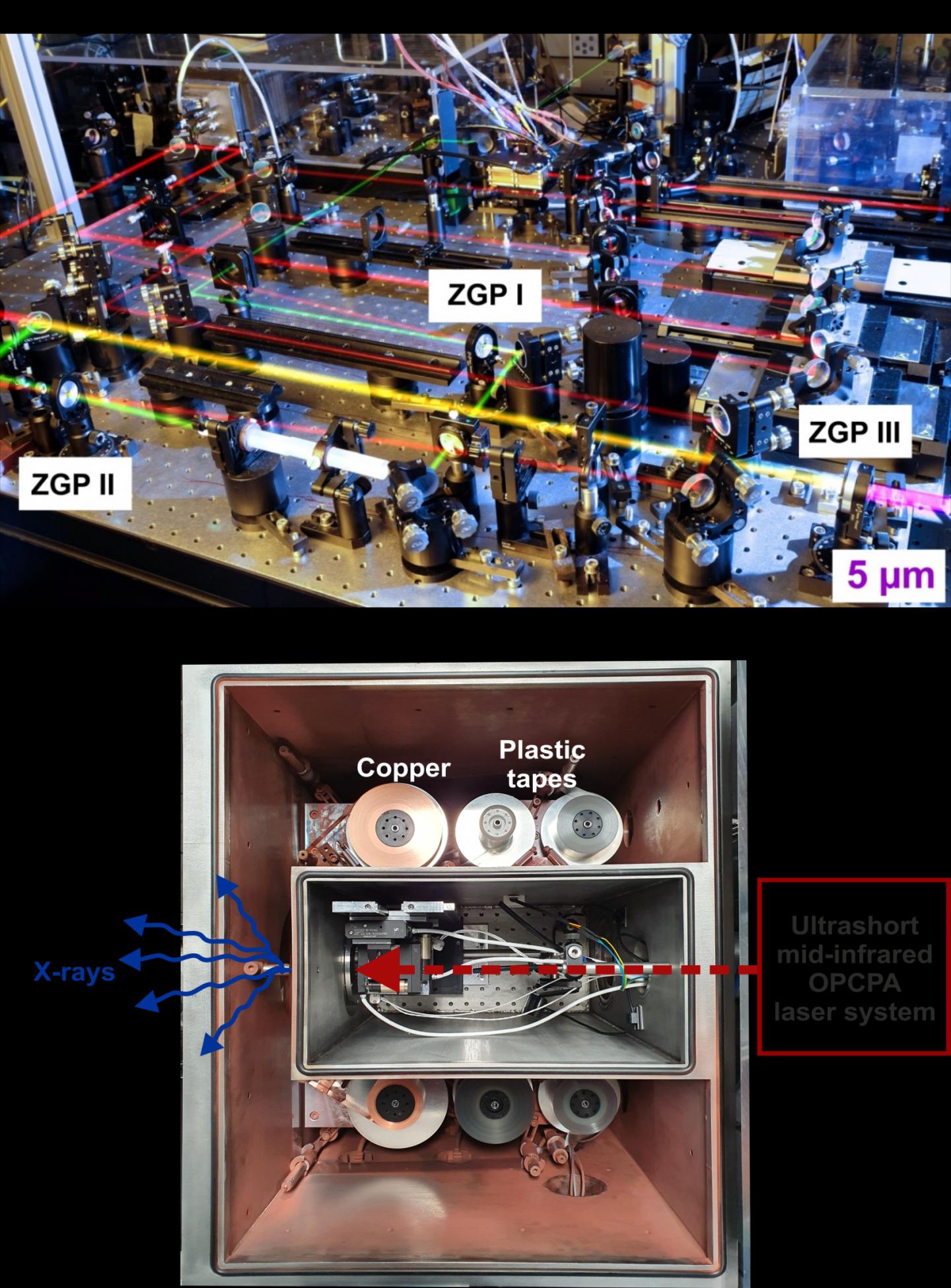 image: Fig. 1: (a) Table-top optical driver generating femtosecond mid-infrared pulses at a wavelength of 5 μm. Nonlinear ZnGeP_2 (ZGP) crystals serve for pulse amplification. (b) Copper tape target for X-ray generation, placed in a vacuum chamber. The intense mid-infrared pulses (red dashed arrow) are focused onto a 20 μm thick copper tape (intercept point of blue x-ray arrows). The copper tape is moved at a velocity of 5 cm/s to provide a fresh target area for each driver pulse. The plastic tapes serve for collection of metallic debris from the target and move in parallel.