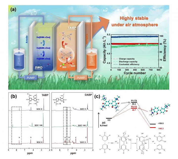 image: (a) A schematic representation of the SWO/TABP flow battery and its cycling test under the air atmosphere at a current density of 40 mA cm-2. (b) NMR spectra of TABP and DABP catholytes at different SOCs. (c) The potential energy surfaces of the Michael addition of two biphenol derivatives and schematic of the Michael reaction showing the nucleophilic addition of H2O followed by re-aromatization and proton exchange.