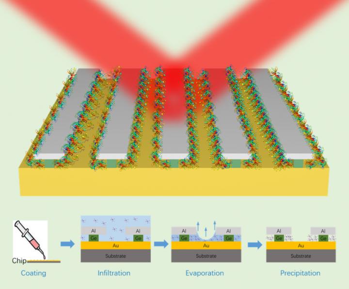 "There are techniques, such as optical tweezers and dielectrophoresis, which can manipulate small particles or even molecules and deliver them to target locations such as the hot-spots. However, these techniques requires significant amount of energy input and are also complicated to utilize." Dr. Liu added, "What we set out to explore is a device structure that can trap analyte molecules precipitated out of a solution into the hot-spots in a passive (requiring no energy input) and effective way, and we realized that we can make use of the surface tension of liquid to achieve this goal."