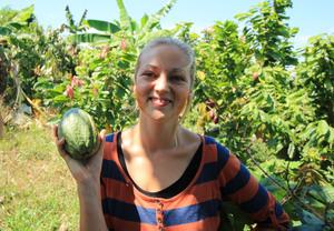 image: Dr Bea Mass with cocoa pod (fruit of the cocoa tree), from which chocolate is made