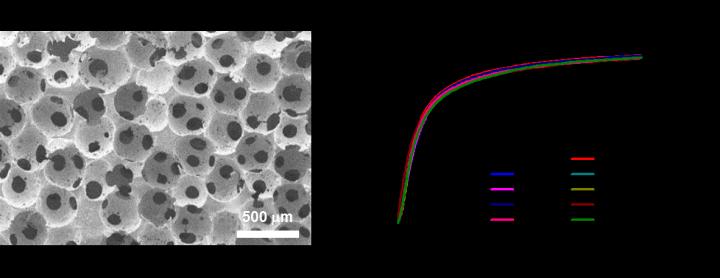 image: This is an image of a porous elastomer template with uniform pore size and shape (left), Graph showing high uniformity in the sensors' performance (right).