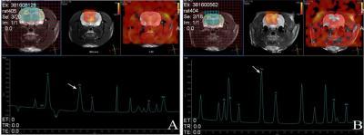 This is a proton magnetic resonance spectroscopy of the hippocampus and thalamus of early growth response protein 3 gene-transfected rats.Choline (Cho; arrow represents Cho peak) content was increased in the left hippocampus of schizophrenic rats (A) compared with bilateral hippocampi of control group (B).
