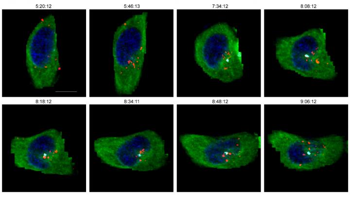 image: Time-lapse fluorescence snapshots of the HIVVpr-mCherry (NL4-3(KFS)) in TZM-bl cells. The aggregation of viral particles in the MTOC and their transport into the nucleus were dynamically traced. Stained for DNA (blue), MT (green), and MTOC marker protein γ-tubulin (turquoise). Scale bars, 10?μm.