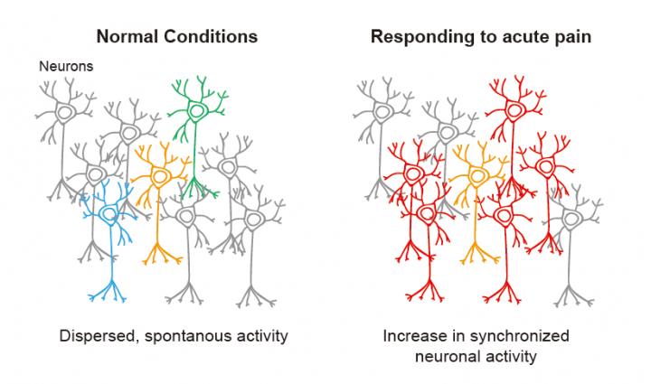 image: Normally neuronal activity in the primary somatosensory cortex is dispersed. However, there is an increase in synchronized neuronal activity when acute pain is experienced.