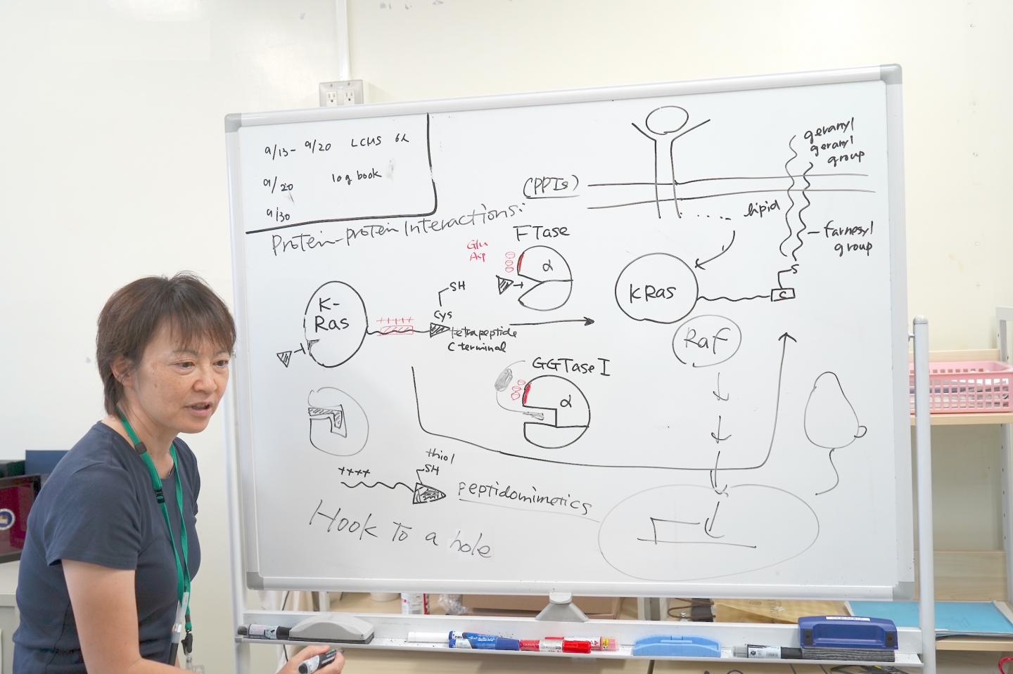 image: Dr. Ohkanda explains the mechanism of her research with K-Ras.
