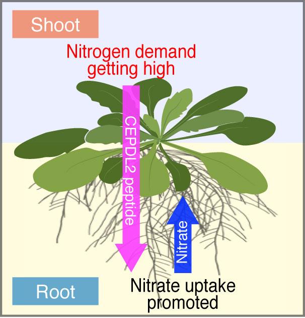 In the new study, Prof. Matsubayashi and colleagues also focused on these hormones in Arabidopsis, analyzing each of their functions and thereby identifying a peptide that can strongly promote the absorption of nitrogen. The peptide, named CEP downstream-like 2 (CEPDL2), was present in leaf veins and would be produced rapidly in large amounts when the leaf ran short of nitrogen. Simultaneously, the CEPDL2 peptide would flow from shoot to roots.