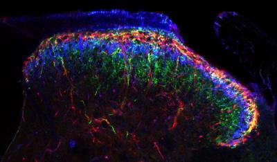 The neural circuit that senses heat and itch is labeled in red. Neural circuits that process other sensory stimuli are labeled in blue and green. The image is from the spinal cord.