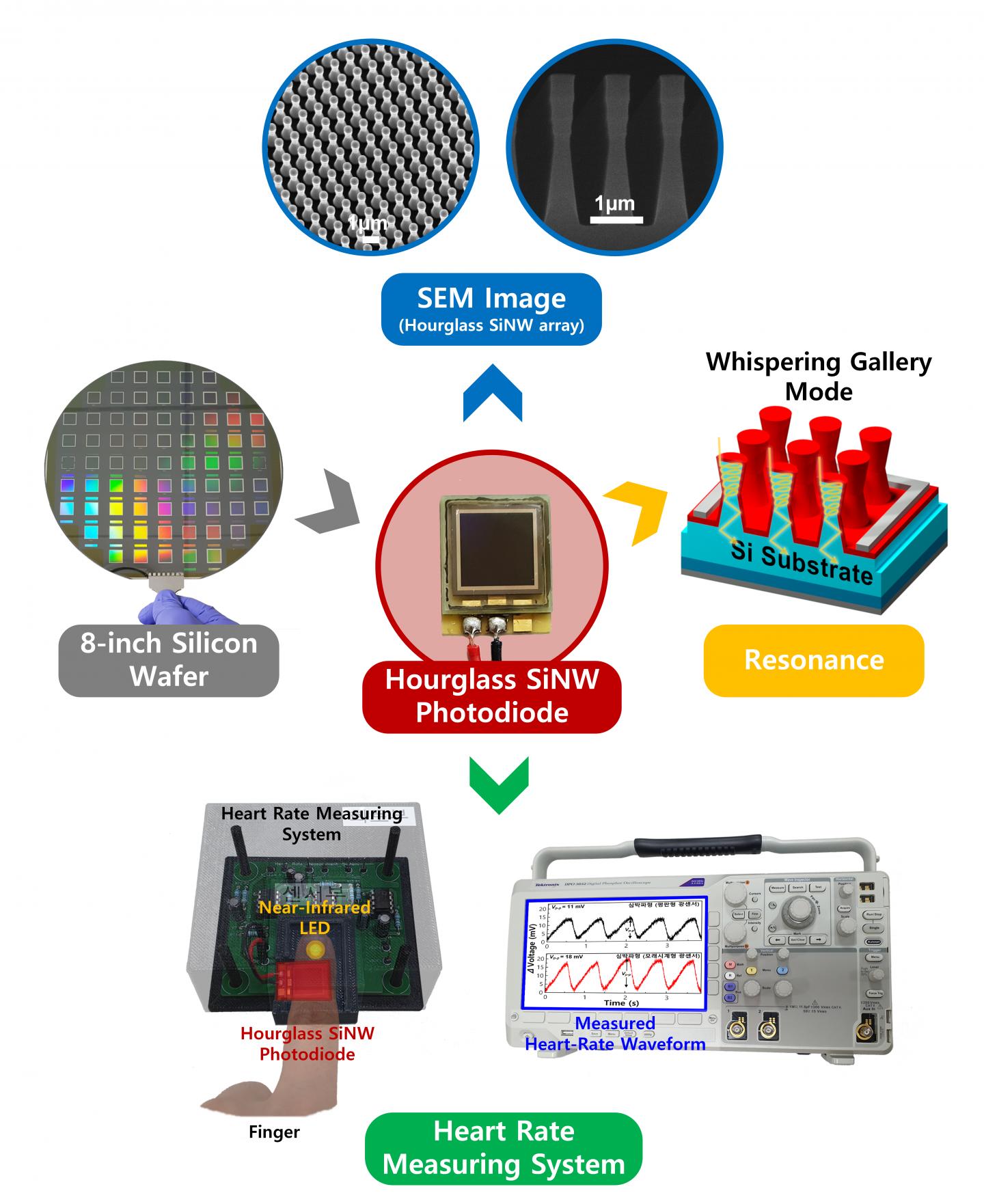 The research team proved that the hourglass-shaped nanowires illustrated 29% increased near-infrared photoreseponse at wavelength of 1,000nm in comparison to the existing silicon photodiode with flat-panel. In addition, this newly developed photodiode was applied to a mobile heart-rate measurement system for demonstration. By doing this, they verified and confirmed of its commercialization when it demonstrated larger wave of heart rate and less than 1% of error rate than the existing photodiodes.