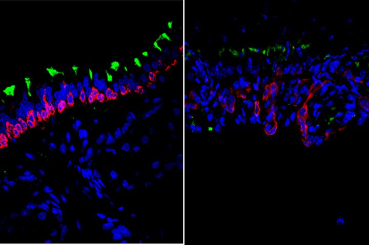 image: Microscopic image showing stem cells in young (left) and old (right) airways with cell nuclei seen in blue, airway basal stem cells seen in red and ciliated cells seen in green.