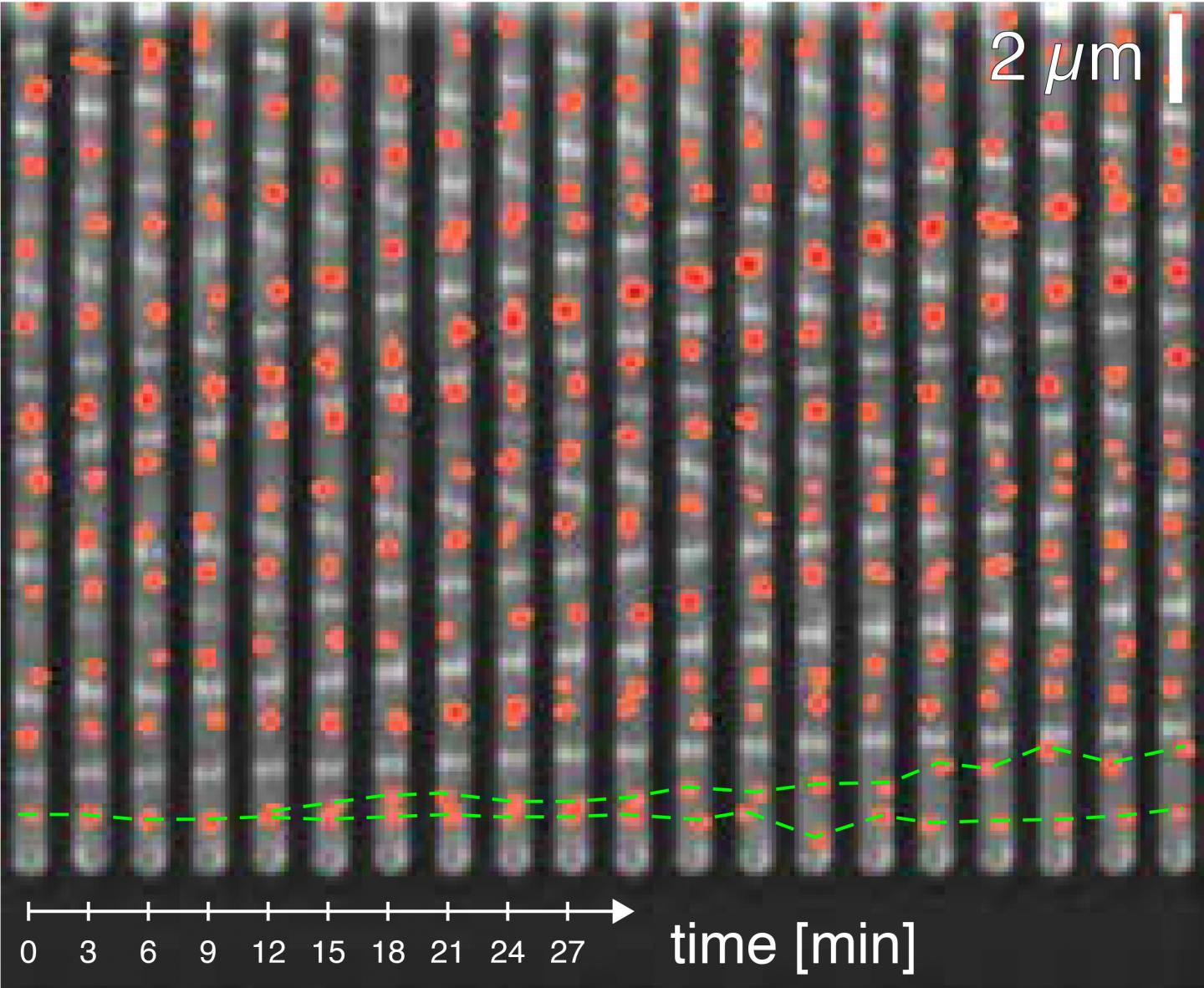 image: Time lapse of E. coli bacteria growing in a microfluidic device, with DNA replication origins visualised as red spots.
