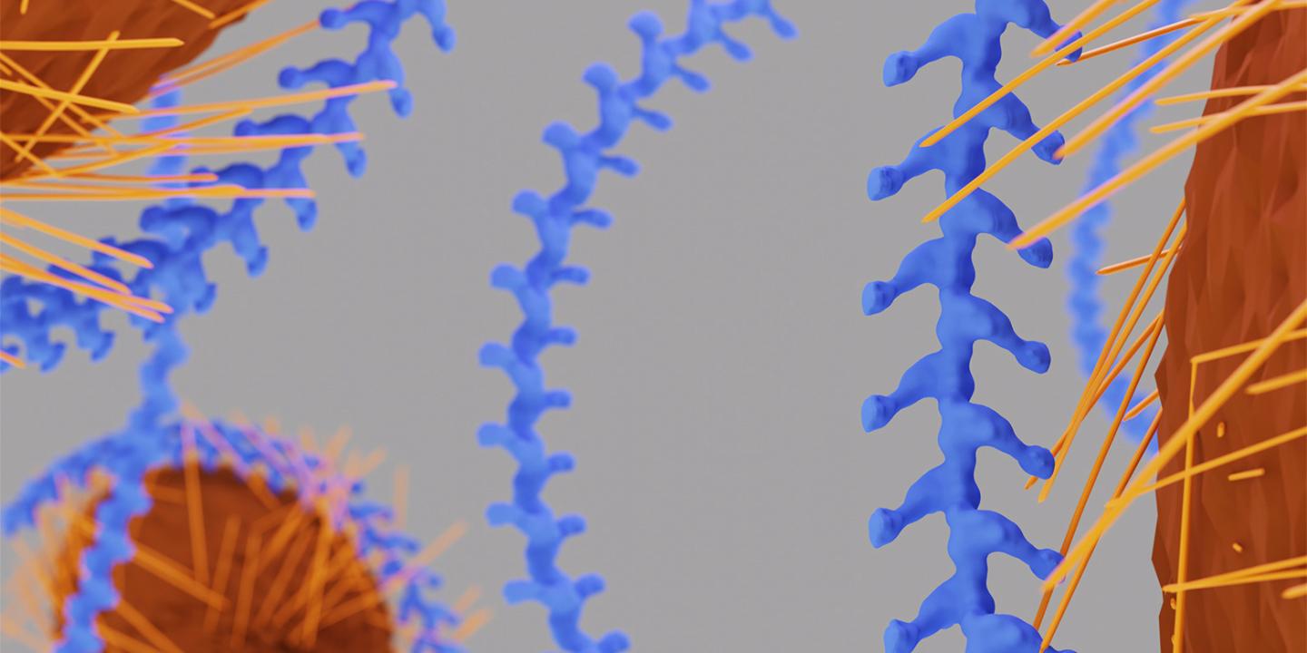 image: A larger scale shows how the uromodulin filaments (blue) envelop an E. coli cell, thus preventing the pathogen's pili from docking on the cell walls in the urinary tract and causing an infection. The image is a 3D visualisation from electron tomography measurements.