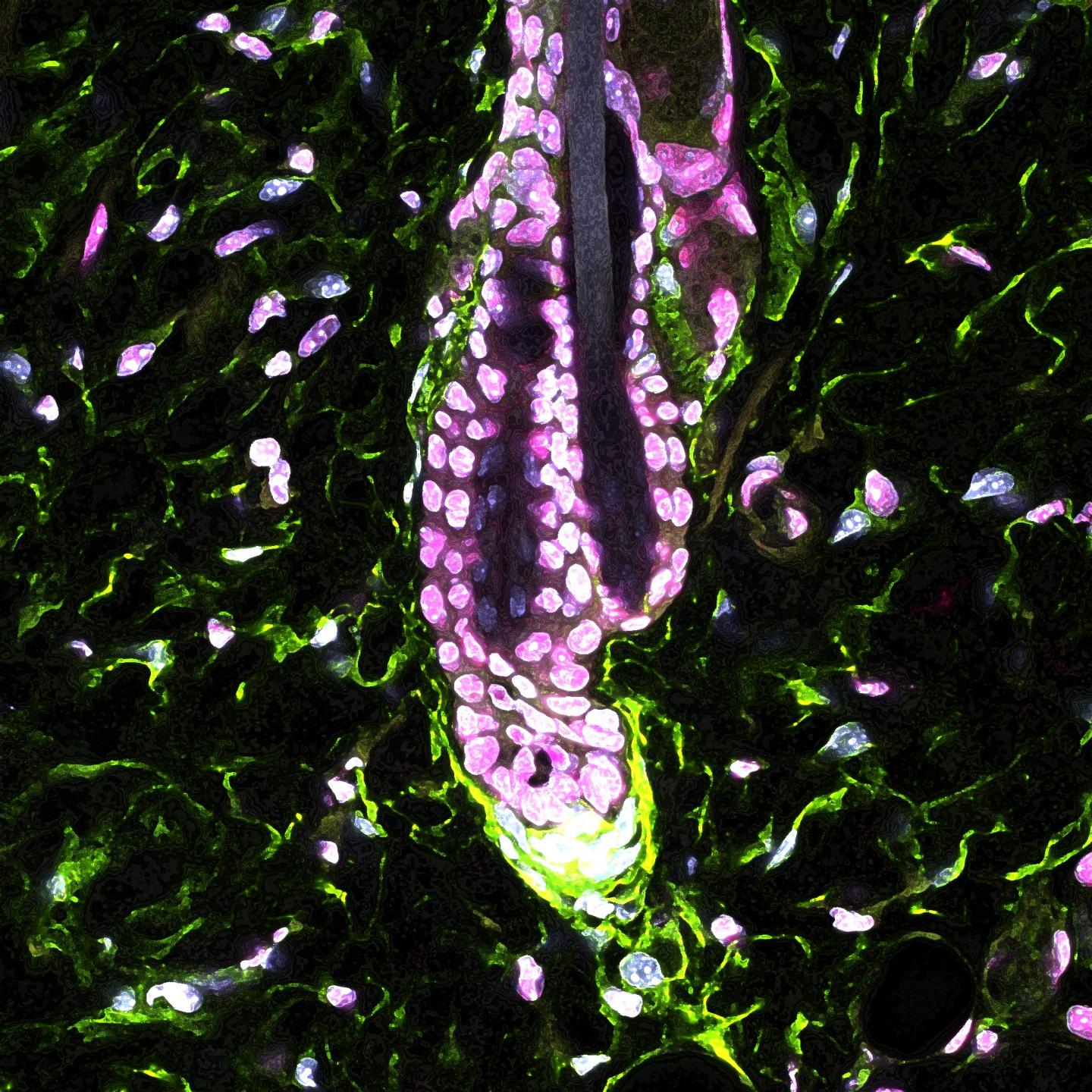 image: Underneath the hair follicle, dermal papilla cells (green) produce the Gas6 molecule that activates hair follicle stem cells. This pathway is impacted by chronic stress.