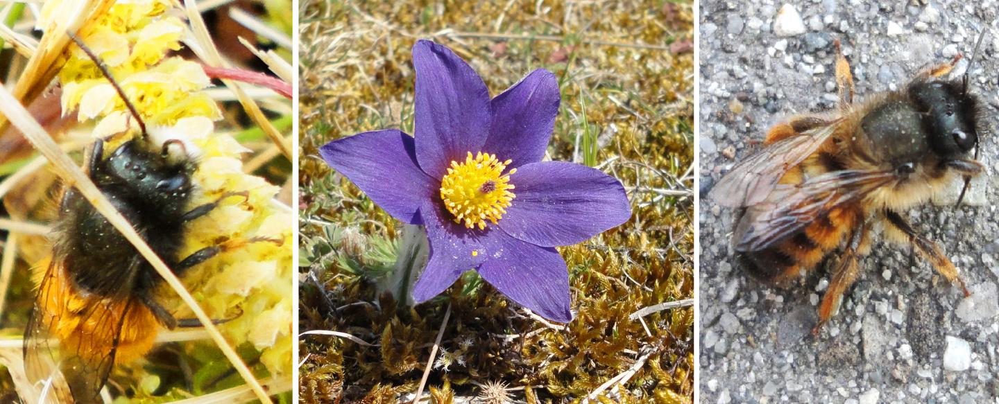 image: Global warming can disrupt the mutualistic interactions of plants and pollinators as in the case of the European orchard bee, the red mason bee and the pasque flower.