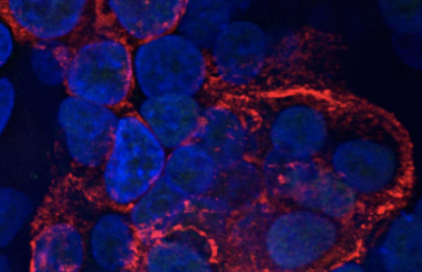 image: Human lung cells (blue) infected with SARS-CoV-2 (red). Courtesy of Hekman, et al.