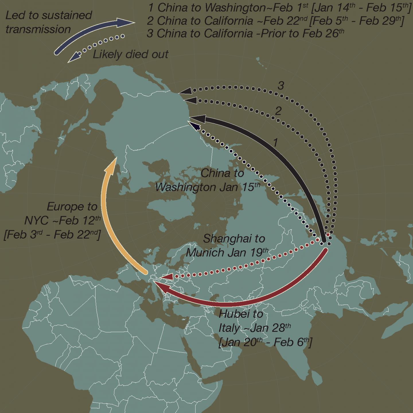 The authors also show that this China-to-Italy-US dispersal route ignited transmission clusters on the East Coast slightly later in February than the China-to-US movement of the virus that established the Washington State outbreak. The Washington transmission cluster also predated small clusters of community transmission in February in California, making it the earliest anywhere in North America.