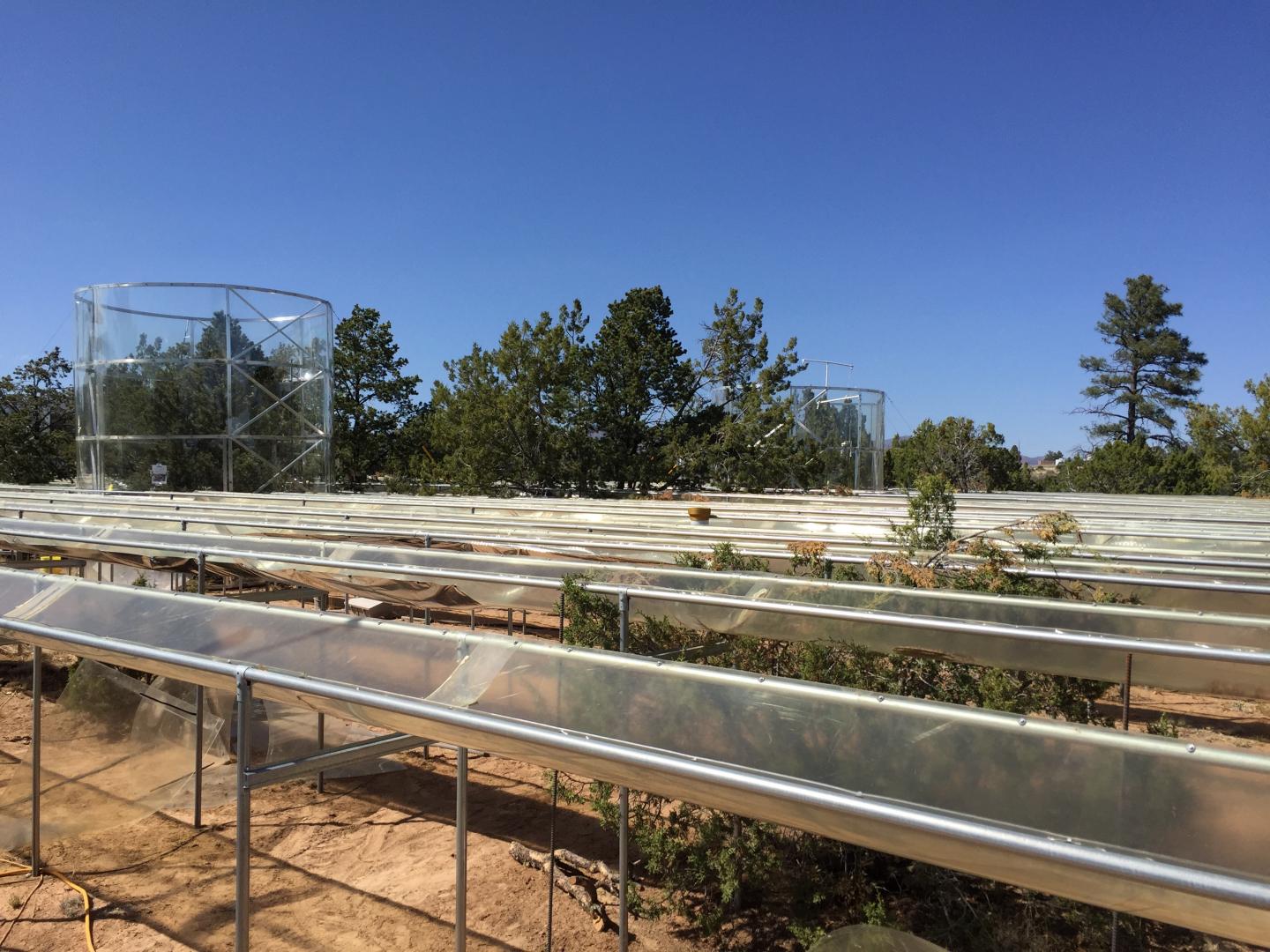 image: Scientists employed computer modeling to study how conifers tap into water sources during drought. As part of the research, the team compared the behavior of modeled trees to that of real trees at the Los Alamos Survival-Mortality experiment site (pictured), where trees underwent drought and heat treatments.