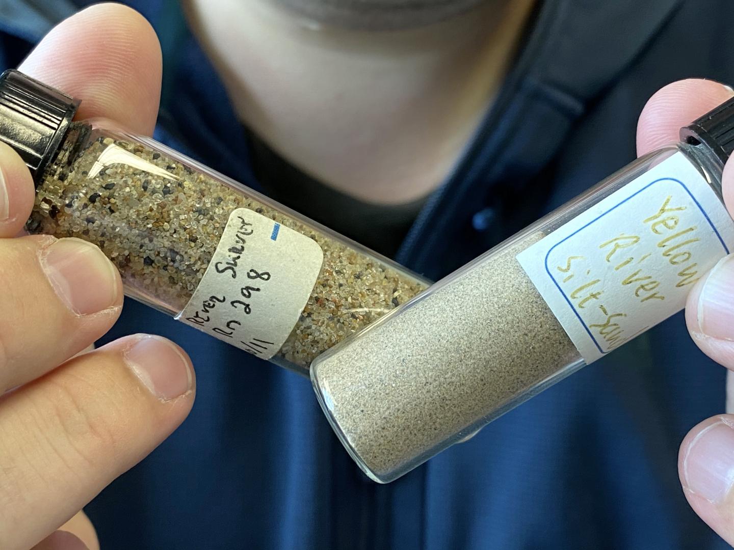 image: Rice University postdoctoral researcher Hongbo Ma holds sand from the Mississippi River, left, and silt from China's Yellow River. Ma led a study that showed particle size controls how sediment moves in flowing rivers changes dramatically when the grains are about 150 microns in size.