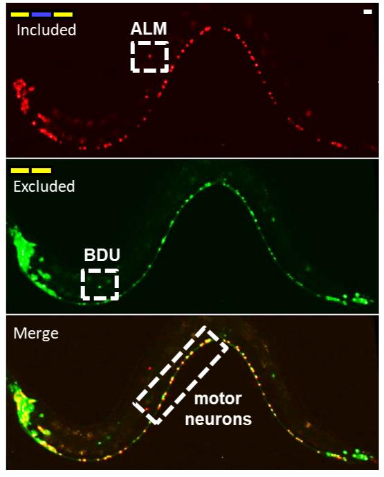 image: The sad-1 gene, present in all of the worm's 300 neurons (visualized by fluorescence), is spliced into different versions in different neurons. Neurons with one version fluoresce red, neurons with the other version fluoresce green, and yellow neurons in the bottom panel contain both versions.