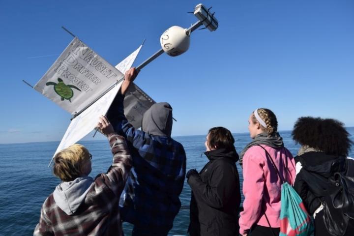 image: High school students from Nauset Regional High School in Eastham, Massachusetts releasing a drifter into Cape Cod Bay in 2016. Mass Audubon's Wellfleet Bay Wildlife Sanctuary worked with the students to study surface currents relative to sea turtle strandings in the fall.
