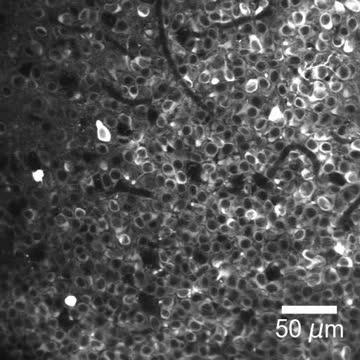 video: 2-photon calcium imaging (5x speed) of the activity responses of neurons in hippocampal area CA1 of a mouse as it learns to associate a neutral tone (conditioned stimulus) with airpuffs (unconditioned stimulus) across a 15 second time delay.
