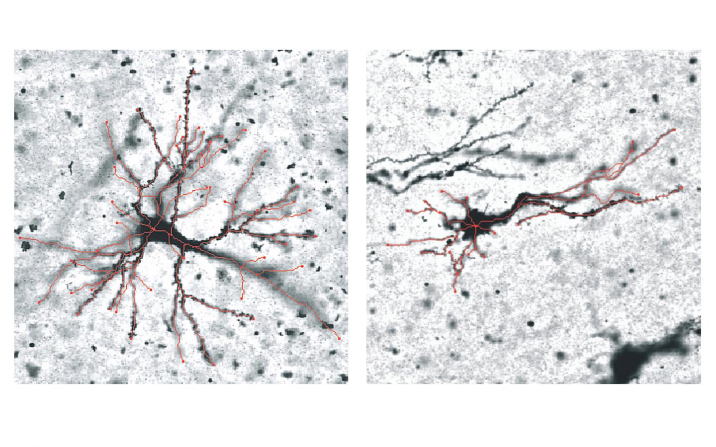image: Grey matter neurons in the outward folds (left) and inward folds (right), with differences highlighted in red. The study found that variations in neuron shape in these regions during the folding process correlate with genetic differences.