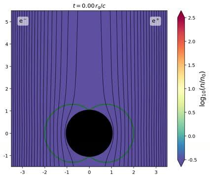video: VIDEO: This simulation shows a rotating black hole (bottom) and a collisionless plasma jet (top). The simulation shows the densities of electrons and positrons, and magnetic field lines. The black hole's "ergosurface," inside of which all particles must rotate in the same direction as the hole, is shown in green.