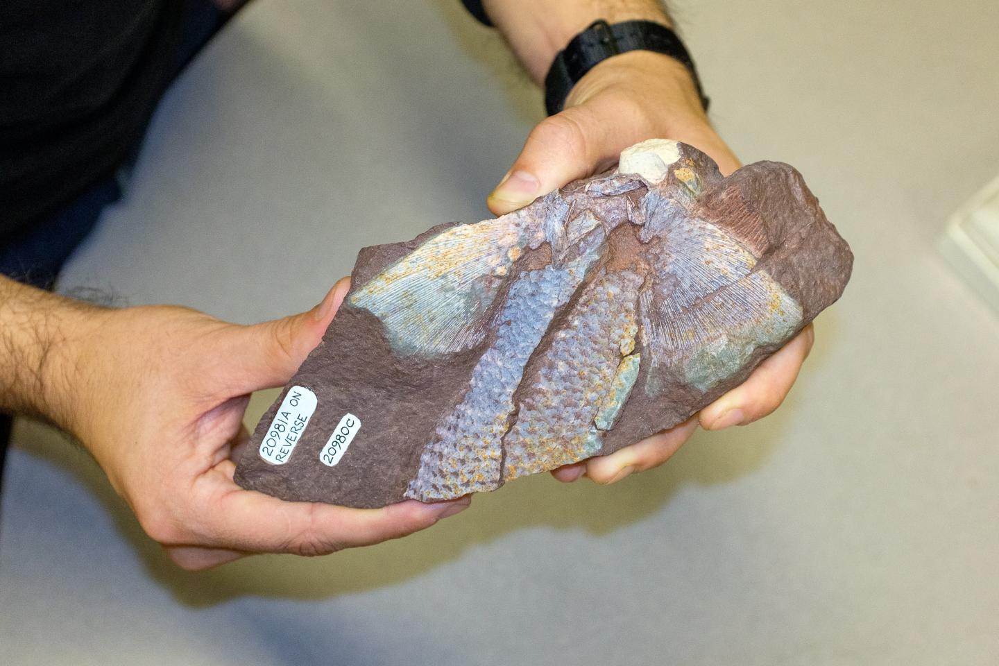image: Tom Stewart holds a fossil cast of a fin from a juvenile Sauripterus taylori, a late Devonian fish with primitive features of tetrapods.