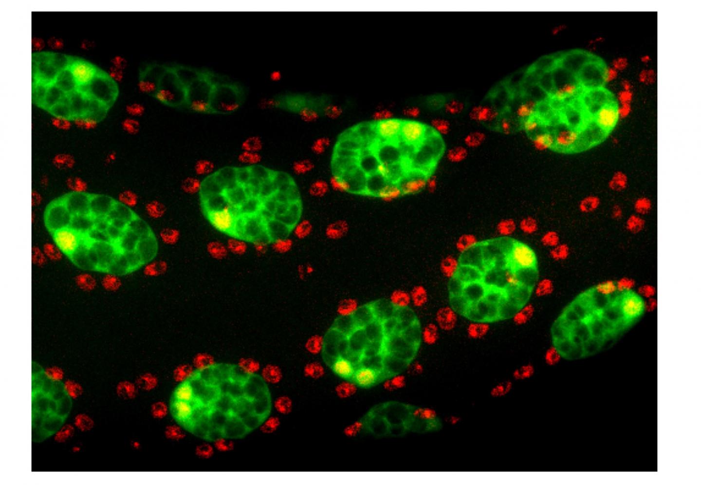 image: Drosophila accessory glands consisting of two cell types (green "secondary cells" surrounded by red nuclei of the "main cells").
