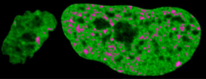 image: Nucleus of a stem cell (left) and its differentiated progeny (right) with liquid-like (green) and gel-like (magenta) parts of the genome.