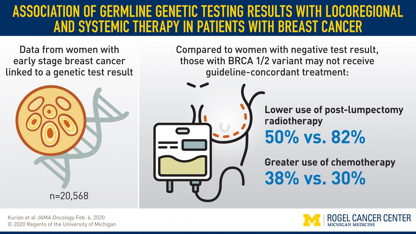 The observed relationship of surgical treatment to genetic test results are in line with guidelines supporting double mastectomy as an effective strategy to prevent future cancer risk. But guidelines do not recommend using genetic testing results to determine whether radiation or chemotherapy are needed to treat the diagnosed cancer.