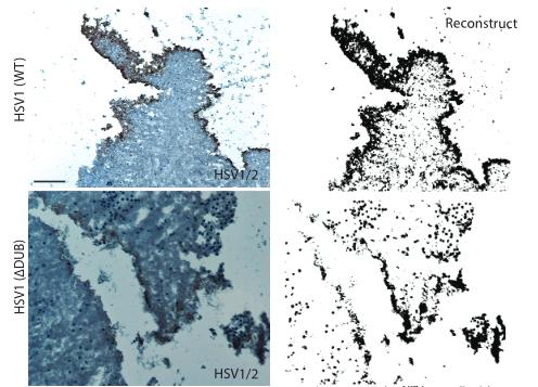 image: Herpes simplex virus (HSV1) replication in brain slices was strongly impaired in the absence of its VP1-2 protein's de-ubiquitination activity (ΔDUB, bottom row), as shown here by the reduced number of virus-producing cells (black). This highlights VP1-2's role in suppressing immunity.