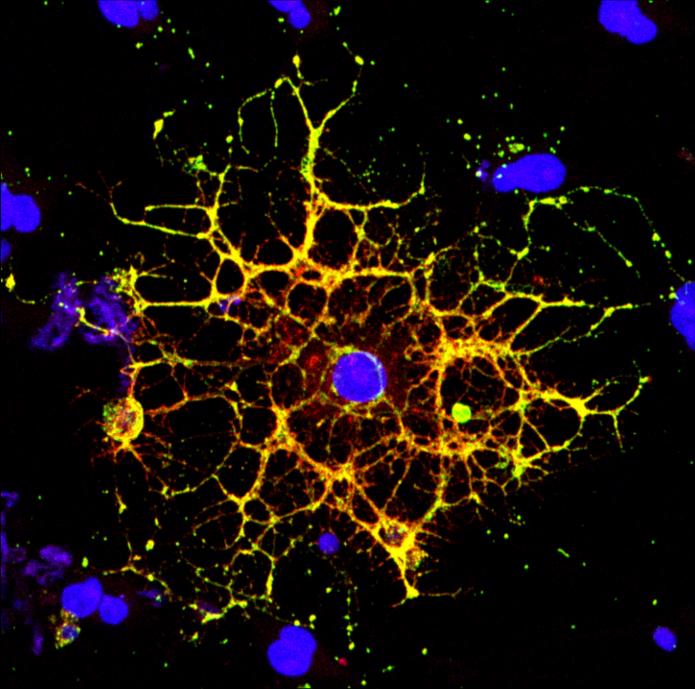 image: A confocal microscope image shows an oligodendrocyte in cell culture, labeled to show the cell nucleus in blue and myelin proteins in red, green, and yellow. Researchers from Penn and CHOP have shown that HIV infection prevents oligodendrocytes from maturing, leading to a reduction in white matter in the brain.