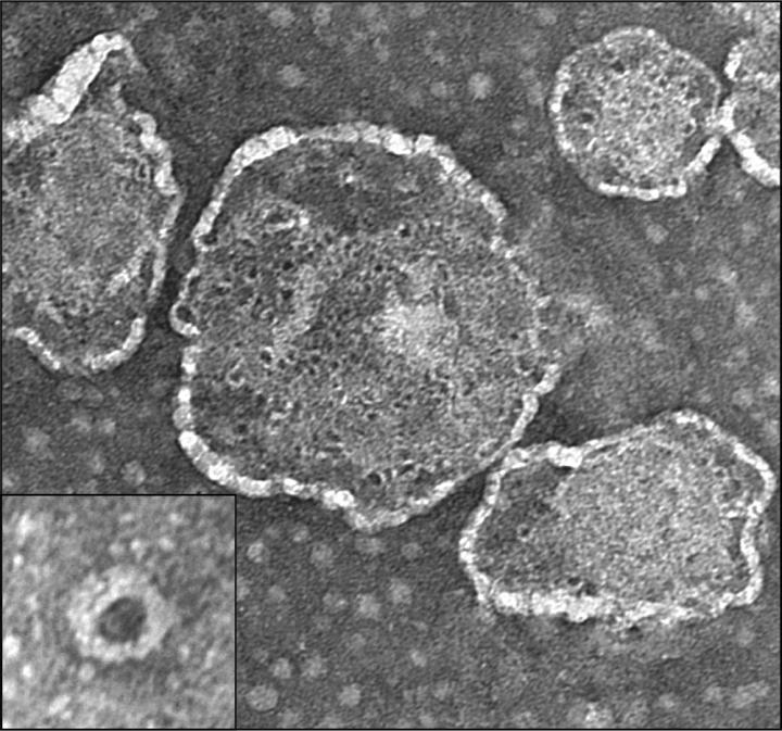 image: A new study finds that gasdermin B (GSDMB) pokes holes in bacterial membranes containing cardiolipin as a novel immune defense strategy. Shown are pictures of GSDMB pores embedded in synthetic bacterial membranes. The inset image shows a purified GSDMB pore.