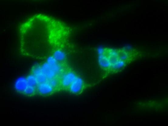 image: Sneaky Spores: This image is of two immune cells (stained green). The smaller cell on top is empty. The larger cell on the bottom is full of the fungal pathogen Cryptococcus (stained blue). Instead of killing Cryptococcus, immune cells (i.e. alveolar macrophages) are implicated in helping Cryptococcus spores escape from the lung to cause disease in the brain.