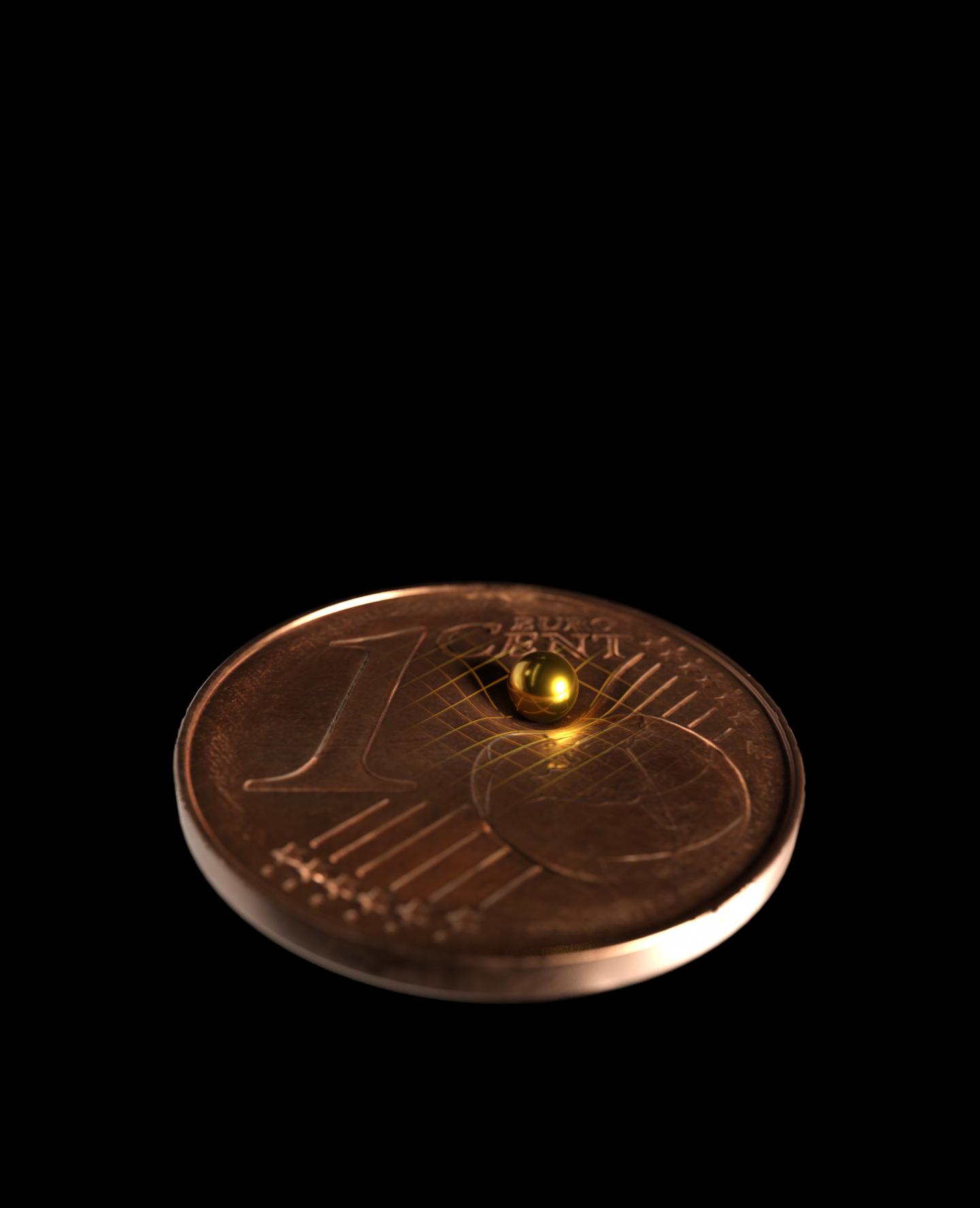 image: The gold ball used in size comparison with a 1 cent coin. According to Einstein's general theory of relativity, every mass bends space-time