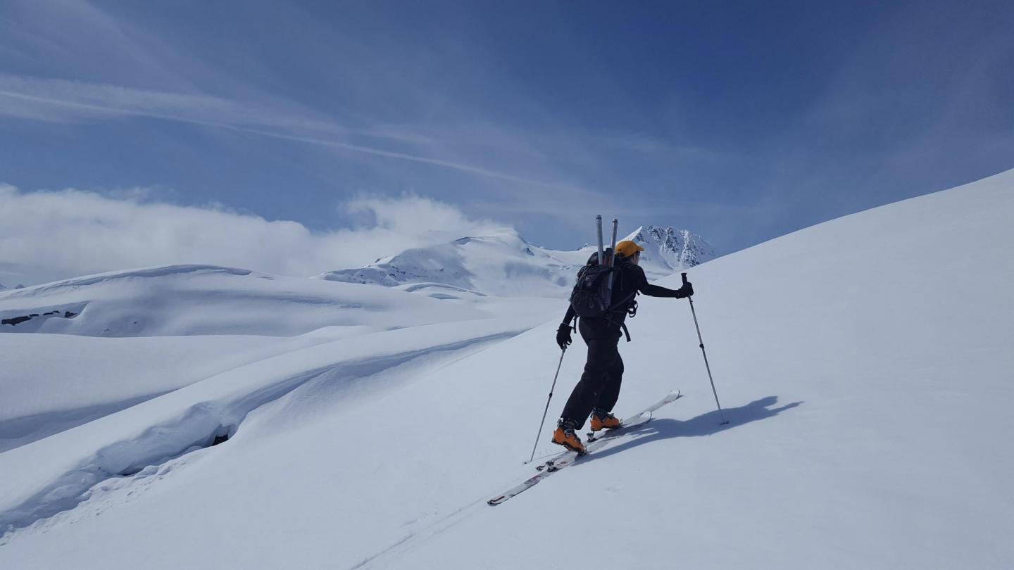 image: OSU civil engineering professor David Hill carries a snow coring device uphill near Thompson Pass, Alaska.