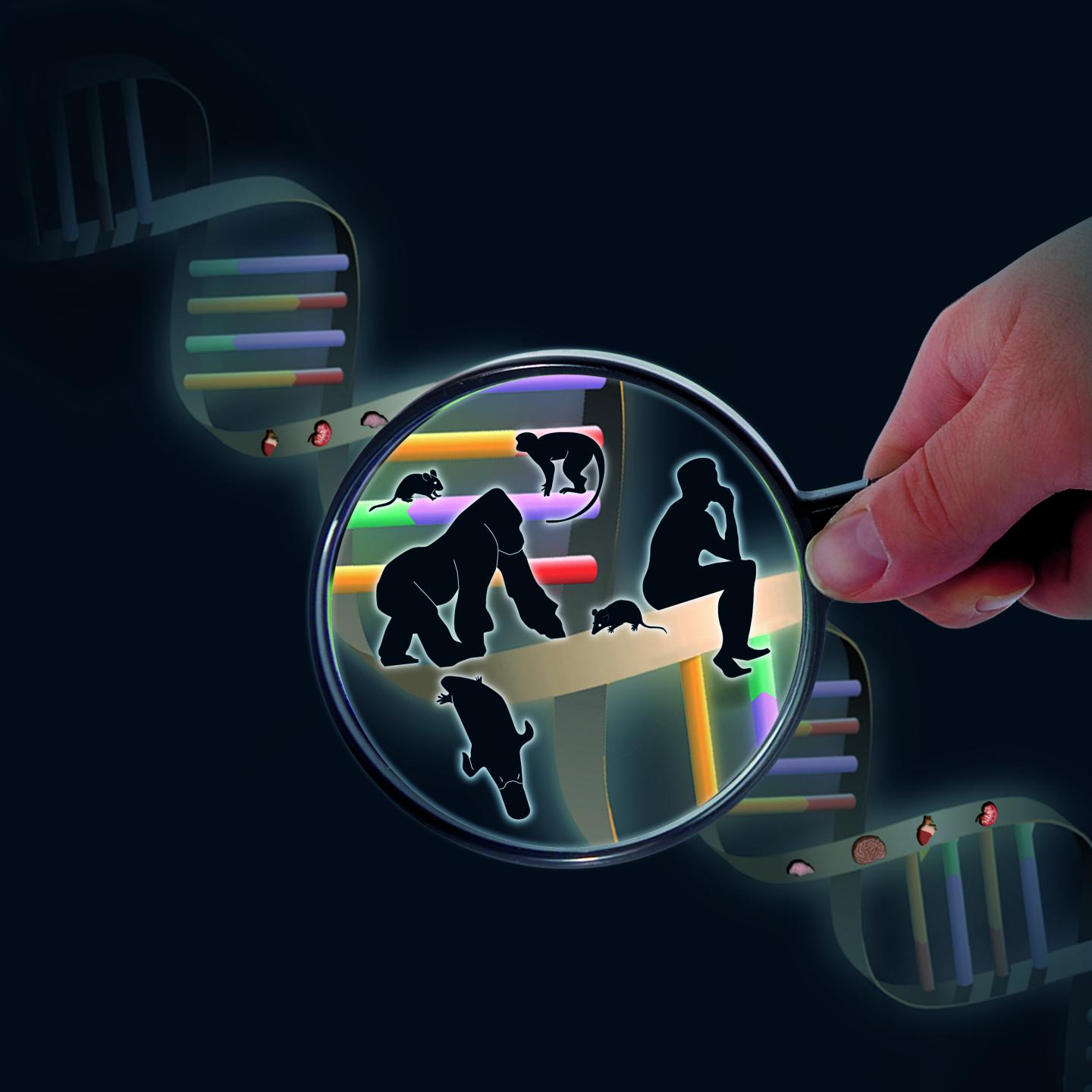 image: Artistic rendering of the genomic bases of organ evolution. The figure shows a DNA double helix with pictograms of mammals and selected organs.