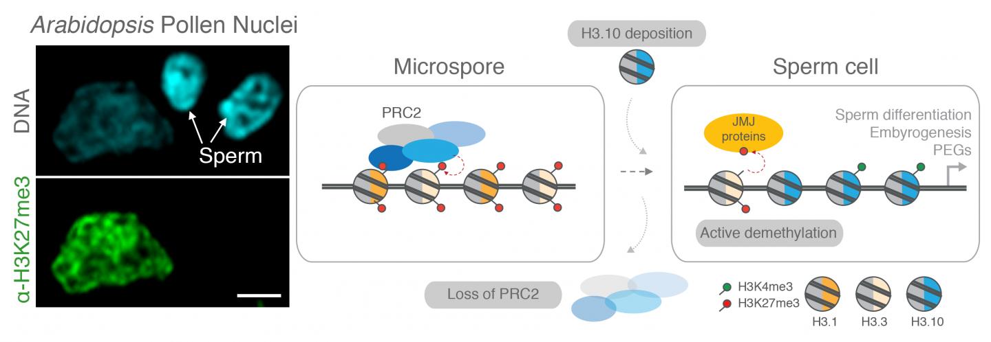 To answer this question, an international team lead by Dr. Michael Borg, a postdoc in the lab of Dr. Frédéric Berger at the Gregor Mendel Institute of the Austrian Academy of Sciences, set out to analyse histones in pollen, hypothesizing that the process of forgetting would most likely occur in the embedded sperm. The researchers were surprised to find that H3K27me3 completely disappeared in sperm. They found that sperm accumulate a special histone that is unable to carry H3K27me3. This ensures that this modification is erased from hundreds of genes, not only those that prevent flowering but also ones which control a large array of important functions in seeds, which are produced once the sperm is carried by the pollen to fuse with the plant egg cell. This phenomenon is called "epigenetic resetting" and is akin to erasing and reformatting data on a hard drive.